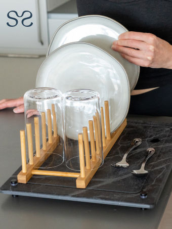 The mat's instantly absorb and disperse water through its network of pores, preventing surface pooling and promoting rapid drying. Elevated on stainless steel feet, the mat's design works with diatomaceous earth to create efficient airflow, keeping your counters dry and spotless.